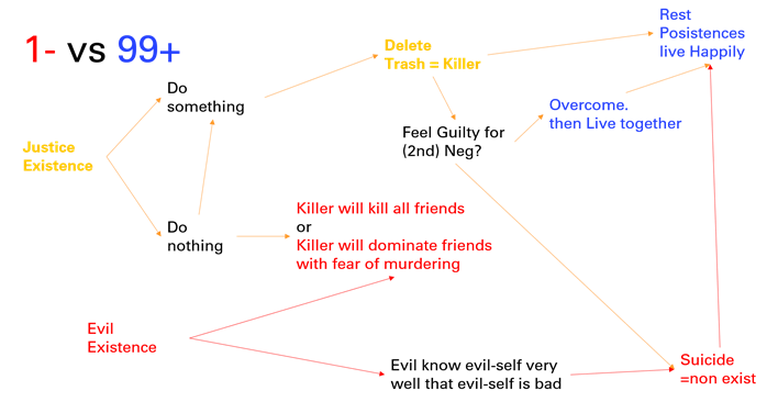 100명 중 [99명은 긍정의 존재]이고 선한 사람들이다. 선한 자신과 같은 상대를 소중히 한다. 어느 누구에게도 1차 부정을 일으키거나 문제를 일으키지 않고 함께 행복하게 잘 살아간다. 그 중 [1명은 부정의 존재]인 살인자이다. 자신이 문제없음을 항상 인지시키지만 가끔 상대를 함부로 한다. 하지만 99명은 선하고 순둥이라 잘 이해를 해준다. 그렇게 함께 잘 살아오며 마을이 생긴지 100일까지는 아무일 없다가. 1명의 부정적 존재인 살인자가 101일째 밤부터 비밀스럽게 살인을 시작했다고 해보자.